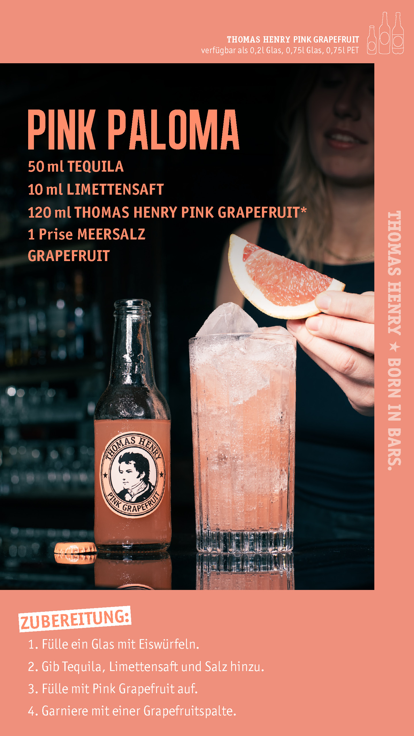 Manchmal hat man den Eindruck, die ganze Welt spricht von Tiki. Aber weiß die Welt auch, wovon sie spricht? Tiki steht für „Eskapismus“, für einen Kurzurlaub auf Abruf, ohne dafür zu reisen. Der Pink Paloma, einer der beliebtesten Drinks Mexikos, spielt dabei eine ganz wichtige Rolle. Weißer Tequila, Thomas Henry Pink Grapefruit und eine Prise Salz werden hier zur unwiderstehlichen Kreation, die süß und erfrischend-sauer zugleich dich und deine Gäste in die Karibik entführt. Sofort! Die besondere Frische und ausgewogene Säure verdankt der Pink Paloma übrigens dem hohen Fruchtanteil unseres Premium-Mixers. Cheers!